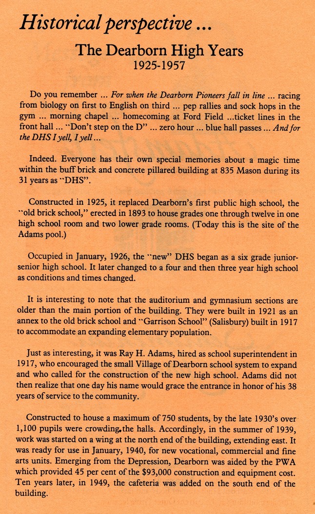 The school building was opened as a facility for grades 6 through 12, and gradually was reduced to a four-year and then a three-year school. The June 1957 class was the last Dearborn High class to graduate from the building. The following September, the school was opened to grades 7th, 8th, and 9th.