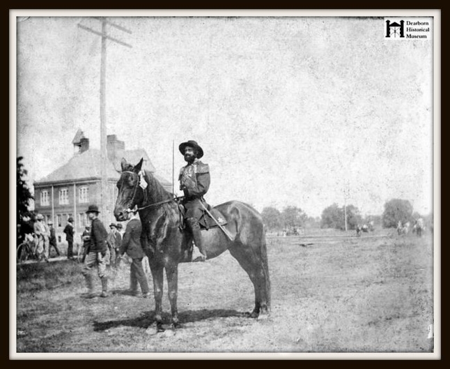 This pic is taken outside the original Dearborn High School built in 1893. The image shows Bernard Magoonaugh (1842-1918) wearing his uniform on the Fourth of July. Bernard served in the Civil War in the Fifteenth United States Infantry. During the firing of a cannon at the Dearborn Arsenal during a service mourning President Lincoln, Private Magoonaugh happened to be in front of the canon when it discharged prematurely and he sadly lost both hands as a result.