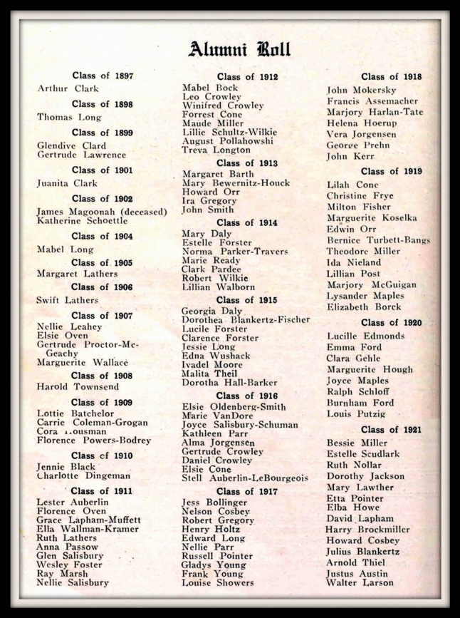 (Note: Some schools were named for entire local pioneer families: Brainard, Coonville, Daly, Dort, Miller, Roulo, Thayer, Whitmore, Bolles, etc.)