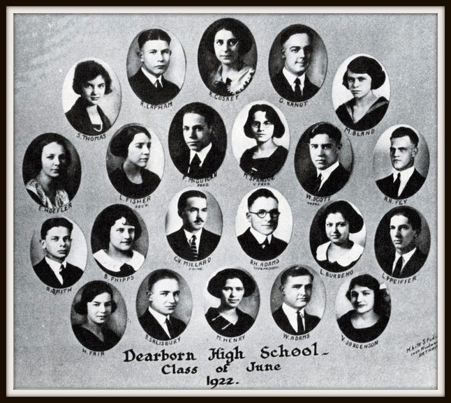 Among memorabilia of old Dearborn High School is this picture of the graduating class of June 1922. In the center of the second row from the bottom are C.V. Millard, Principal, and Ray H. Adams, Superintendent of Schools. Old Dearborn High, located on Mason Street between Morley and Garrison, became Ray Adams Junior High when a new high school was built on Outer Drive. Because of declining enrollments, Adams closed in June 1982. By zooming in on this picture, we can determine that F. McGuigan was the DHS '22 class President, M. Sprague was the class Vice President, W. Scott was the class Treasurer, and L. Fisher was the class Secretary. This class picture appears to have been prepared by White Studio at 1924 Woodward, Detroit. Assuming the entire class is included in the picture, the size of Dearborn High School's graduating Class of June 1922 was 20 (excluding the Principle and Superintendent). The largest graduating class of Dearborn High School was the Class of 1971.....with a graduating class size of 640 (635 June and 5 August graduates). [Photograph courtesy Bill Gemmell]