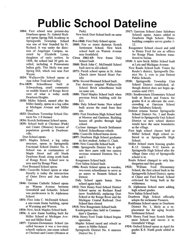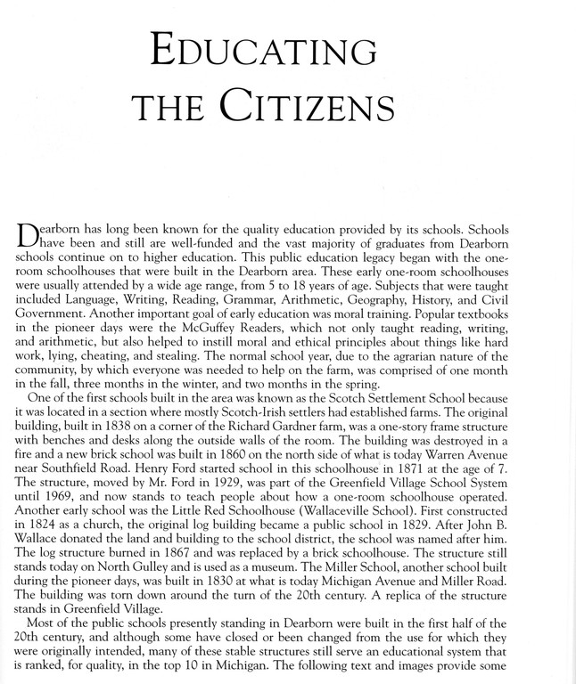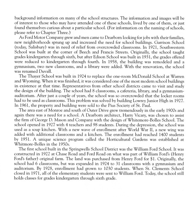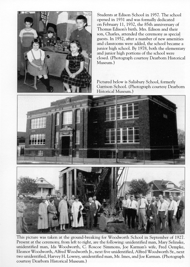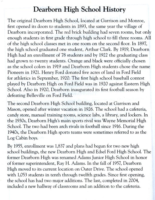 The following historical information concerning our Dearborn public schools (wherein many of us spent a lot of our childhood days) can be found in Chapter 5 of Images of America - Dearborn, Michigan by Craig Hutchison and Kimberly Rising, Dearborn Historical Museum, City of Dearborn, published by Arcadia Publishing, copyright 2003.