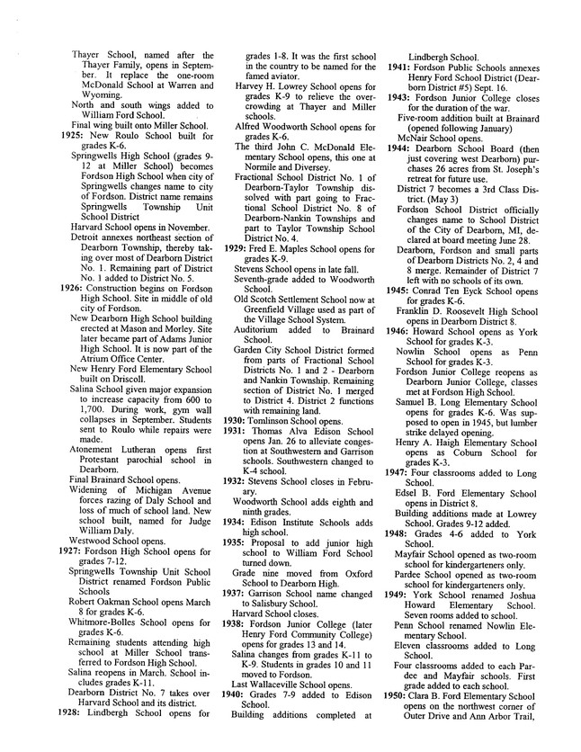 The first cornerstone for Woodworth School was laid in September of 1927 and was opened the following September as a kindergarten through 6th grade school. In 1932 the school added its Junior High school section, and in 1937 a swimming pool, larger cafeteria, music rooms and a small auditorium. In 1940, the Fordson Board of Education purchased additional property to the west for a playground. The school is still currently open and houses grades kindergarten through 8th grades.