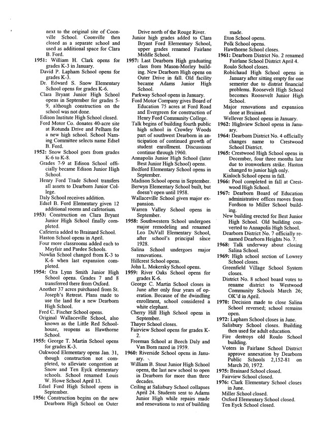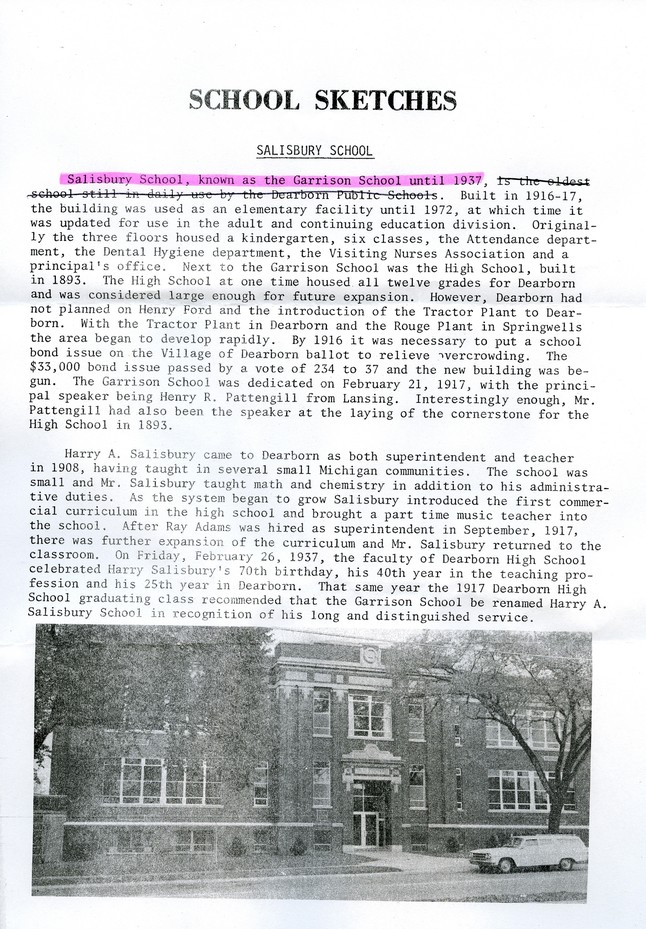 The following article was published by The American Local History Network - Michigan. Its author and date are unknown but it must have been written before the early 1970s because it makes reference to Garrison School as "now Salisbury"......but Harry A Salisbury Elementary School ceased to operate as a Dearborn public school in the early 1970s. One unusual aspect of the article is that is does not make any reference to Ora Lynn Smith junior high school (where many DHS '71 classmates went to school). The article's emphasis seems to be more on the founders and construction of various schools than on their enrollment or operations as learning centers. Since this article concerns Dearborn public schools (as do the above articles), no mention is made of well known Dearborn parochial schools such as Sacred Heart, Divine Child, or St. Anselm.