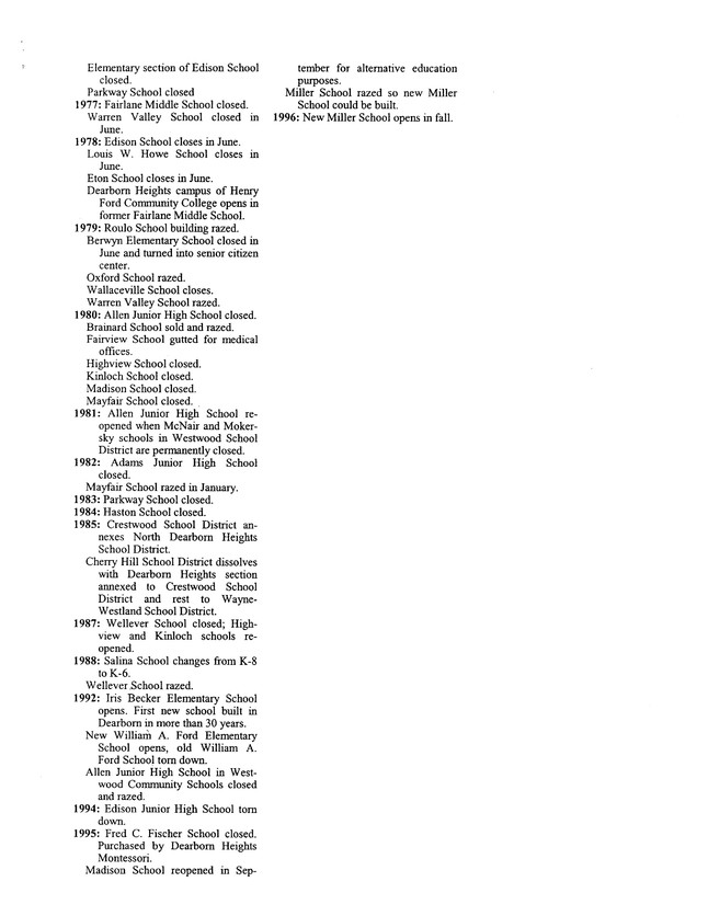 By March 1971, Fairlane ceased to be an independent school district and was used as a 6th through 9th grade facility by the Dearborn Public Schools, until June of 1977. This was later remodeled and reopened as a branch of the Henry Ford Community College, Dearborn Heights Center, in September 1978.